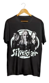 Camiseta preta com estampa da banda Silverchair, mostrando os três integrantes e o nome da banda em fonte estilizada.