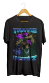 Camiseta preta com estampa de Travis Scott, apresentando o rapper em várias poses e elementos gráficos vibrantes.