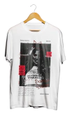 Camiseta branca com estampa da cantora Luisa Sonza, incluindo fotos e frases relacionadas aos "26 Escândalos Íntimos".