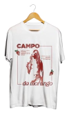 Camiseta preta com estampa em rosa da cantora Luisa Sonza, destacando a frase "CAMPO de morango".