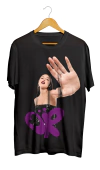 Camiseta branca com estampa de Olivia Rodrigo, apresentando uma imagem dela fazendo um gesto de "pare" e o logo "OR" em roxo.
