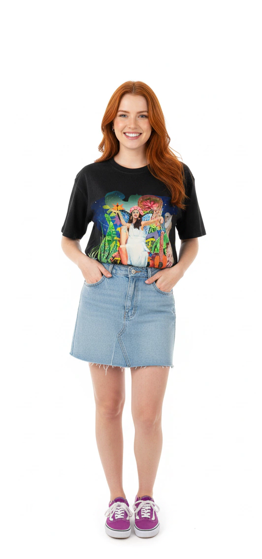 Entre violões, flores e um toque surrealista, a imagem traduz o universo de Marisa Monte em forma de arte vestível. A modelagem oversized e o algodão premium garantem conforto e leveza, enquanto o design transmite liberdade e sensibilidade.